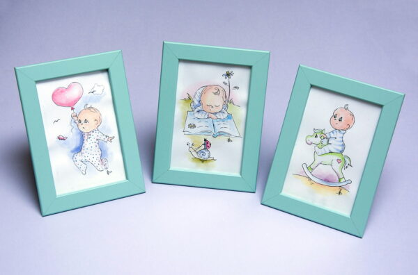 Babaköszöntő ajándéknak, keresztelőre, születésnapra, névnapra, vagy abból a célból, hogy a nagytesó is kapjon valamit babalátogatáskor, kiváló választás ez a babakép. Ez az egyedi, kézzel rajzolt és akvarell technikával festett mesekép dísze lehet a gyerekszobának. Az illusztrációkat Benyó Gabriella festőművész készítette. Az alkotást babarát, tesztelt és jóváhagyott keretbe foglaltuk, így gyerekszobában is használható. A műanyag előlap teljesen biztonságos. A keret akvamarin színű, mérete 10 x 15 cm. Lányoknak és fiúknak egyaránt ajánljuk.